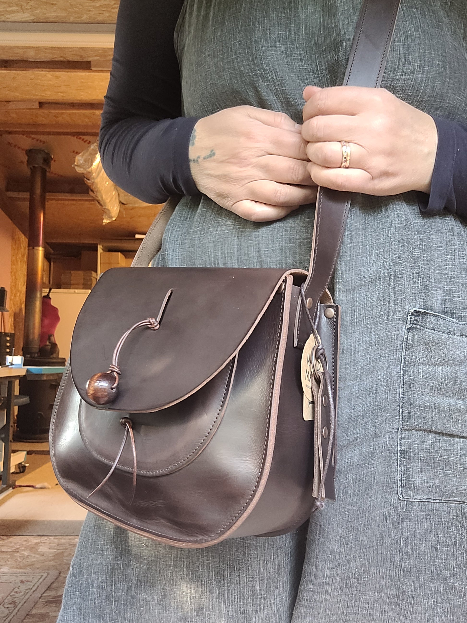 The front flap shape is placed intentionally on the raw edge of the hide for unique effect. If you prefer a classic rounded shape please ask.